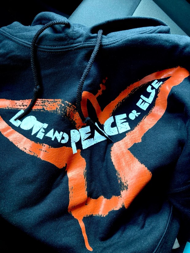 It features the bold ‘Love and Peace or Else‘ graphic on the front while the back carries familiar iconography capturing the band’s music & tours from War to LoveTown, PopMart to Elevation, U2IE to U2:UV