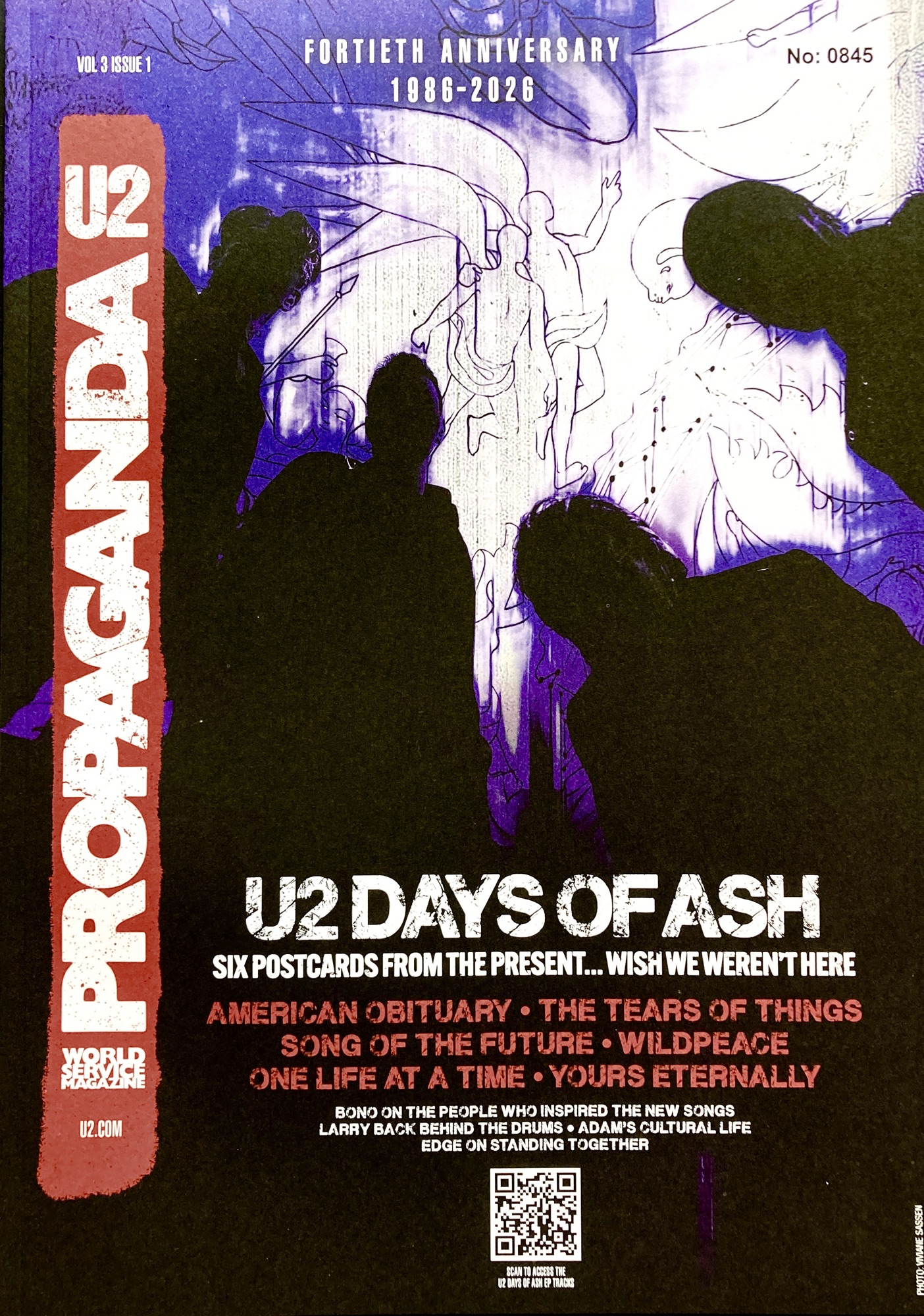 The U2 Days of Ash EP was accompanied by the return of ‘Propaganda’ as a one-off digital zine, with a limited-edition print run – forty years after the first issue of ‘Propaganda’ dropped through the letterboxes of U2 fans around the world. The 52-page special publication ncluded exclusive interviews with ‘Yours Eternally’ film director Ilya Mikhaylus and film producer Pyotr Verzilov, as well as musician and soldier Taras Topolia.