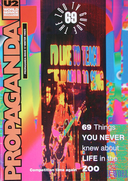 | 1 | 17 | 1992 | Sixty Nine Things You May Not Have Known About Life in the Zoo. Propaganda Mailbag_A bumber crop of your letters, pictures and assorted feats. Gavin Friday_ The former Prune drops in for a chat with Propaganda. Set Them Free_ Two more people worth writing some lines for. A Fan´s World_ A Look Through some of the burgeoning ranks of Propaganda´s unofficial friendly competitors. Great cartoons. More readers pics. Fanzine Directory_ Who´s publishing what fanzine, where. Grapevine_ You heard it on here first. Competitio Time_ your chance to win the latest U2 video release. Shee Music_ Play it yourself Sam.[40pg] |