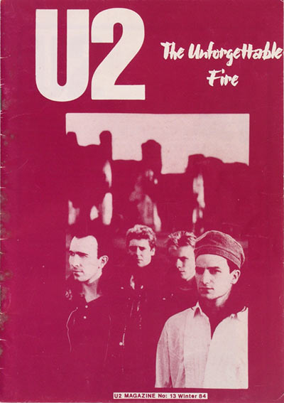 | 13 | ![]() | Winter 1984 | Dennis Sheehan – U2’s Tour manager looks back – interview U2 on Tour October ’81 – original Tour Map U2 B&W center poster – on 2 pages U2 Pen-Pals / Swops and Trades Section U2 Live Competition U2/Paris – Espace Ballard 25.Oct. 84 – concert report Lyrics: Bad / MLK Brief comments from U2 Fans U2’s current Setlist | |