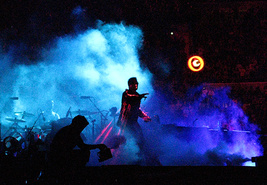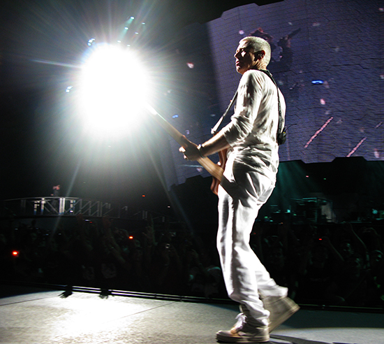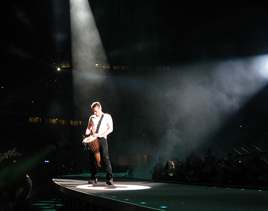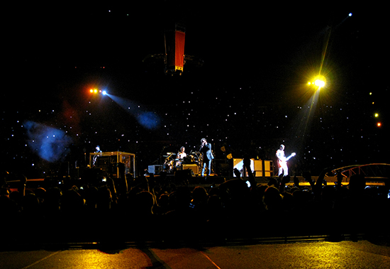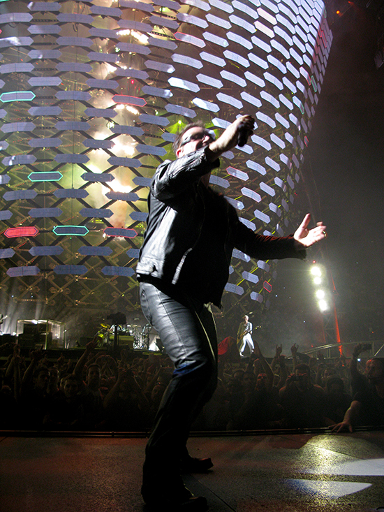 Pronto pudo confirmarse la fabulosa pegada de la banda. New year’s day, uno de sus clásicos absolutos, sonó con tanta potencia que mientras lo hacía era difícil imaginarla sonando en un equipo de sonido casero. U2 en directo funciona así. Todo es colosal, es épico. La exhibición de musculatura es irreprochable técnicamente, aunque el planteamiento tiene una consecuencia inevitable: la escala del concierto es tan faraónica que a veces la emoción se dispersa en algún punto de su recorrido entre los músicos y el público. Agudizaron esta impresión Get on your boots y Magnificent, del reciente y destemplado No line on the horizon. De todos modos, Mysterious ways, del extraordinario Achtung Baby, volvió a elevar la fiebre inmediatamente.